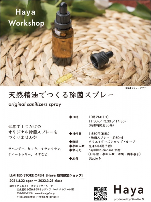 今回は、14期初出店の「Haya」が、ワークショップを開催。ラベンダー、ヒノキ、イランイラン、ティートゥリー、ゆずなどの天然精油で除菌スプレーをつくるワークショップです。