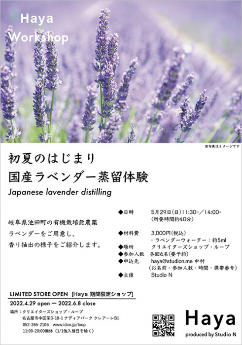 今回は、Loop2022に期間出店する(4月29日〜6月8日)「Haya」が、岐阜県池田町の有機栽培無農薬のラベンダーウォーター5mlをお持ち帰りできる蒸留体験会を開催します。
