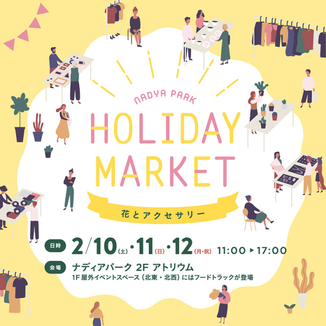 ナディアパークにて、花をモチーフにした雑貨・小物とアクセサリーを集めた「ナディアパーク ホリデイマーケット “花とアクセサリー”」を開催。2Fアトリウムのイベントスペースで物販20店舗と、1F屋外イベントスペース(北東・北西)でフードトラック3店舗の、計23店舗が出そろいます。クリエイターズショップ・ループからは、SAMO serendipity、SAWAKO KATAOKA、naonao、靴下のhacu、Hayaの5者が出店します。