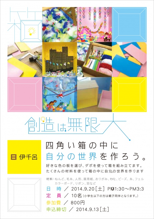 伊千呂ワークショップ「創造は無限大 四角い箱の中に自分の世界を作ろう。」(フライヤー・イメージ)