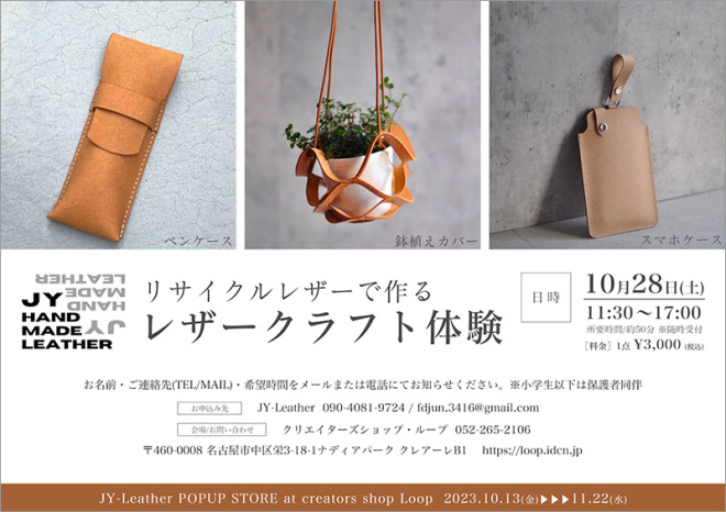 | 問い合わせ先 | クリエイターズショップ・ループtel052-265-2106、JY-Leather(担当:吉川)fdjun.3416@gmail.com |