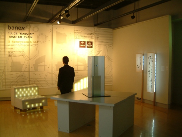 世界最大の家具見本市「04ミラノ・サローネ」に合わせて、ミラノ・ドーモ前「Abbeyデザインギャラリー」で展示されたLEDチェア「傾きkabuki」、04フランクフルトメッセ「LED EKTRA SHOW」に出展されたLEDチェア「QUBE」、高輝度LED新モジュール使用のスタンドやピクチャー・ライトなど新作15点、商品化準備中の「万博LEDバッジ」など、落合勉のデザインによる作品の数々を展示。その他、04年11月、ビックサイト「インテリアトレンドショー」で発表されたアカリイマージュ展のLED作品から秀作10点ほどを展示します。