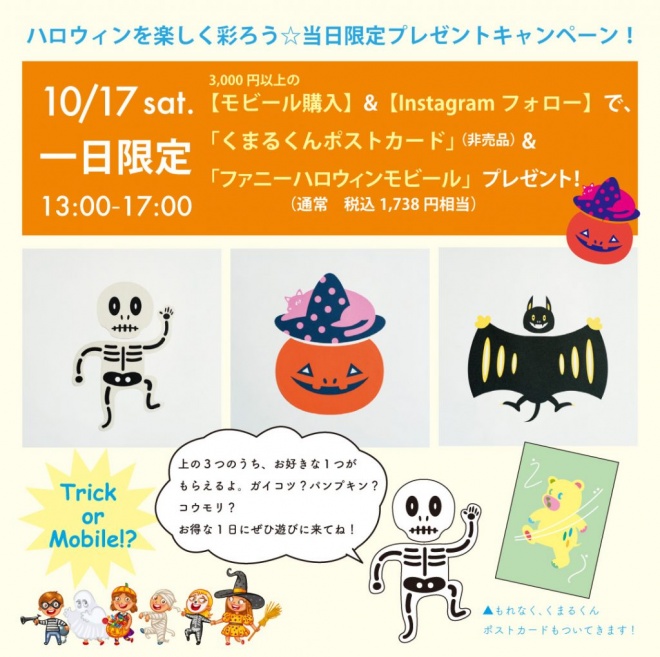 今回は、Loop13期通年出店の「Manu Mobiles」が、プレゼントキャンペーンを実施。10/17当日限定で、3,000円以上のモビール購入&Instagramをフォローいただいた方に、「ファニーハロウィンモビールキット(ガイコツ、パンプキン、コウモリの3種類からお好きな1点、通常1,738円相当)」と「くまるくんポストカード(非売品)」をプレゼントします。当日は、Manu Mobilesクリエイターの今井淳二郎が来店します。