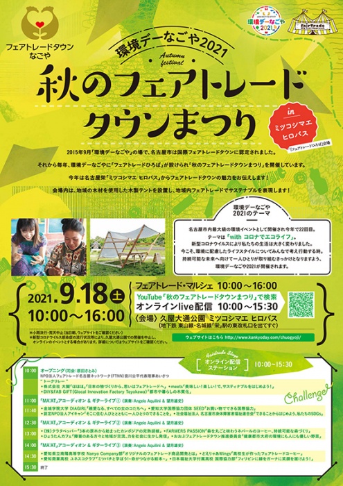 名古屋市は、2015年9月に国際フェアトレードタウンに認定。認定後、「環境デーなごや」の一環として毎年開催されている「秋のフェアトレードタウンまつり」、今年は、久屋大通公園「ミツコシマエ ヒロバス」を会場に、マルシェやオンラインLive配信によってフェアトレードタウンの魅力を伝えます。