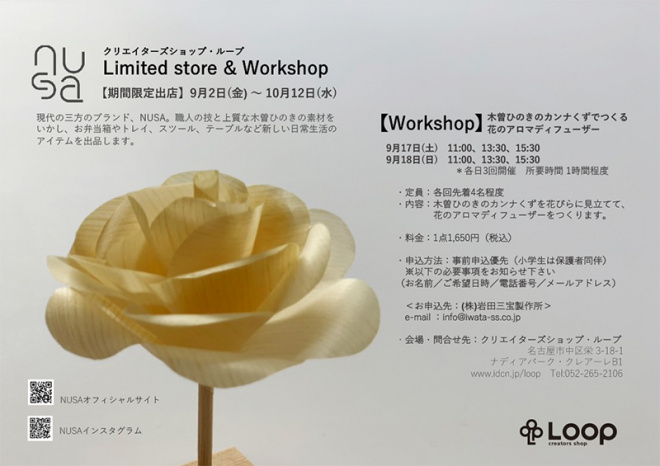 | 問い合わせ先 | クリエイターズショップ・ループtel052-265-2106、NUSA(株式会社岩田三宝製作所)tel052-671-1720、info@iwata-ss.co.jp |