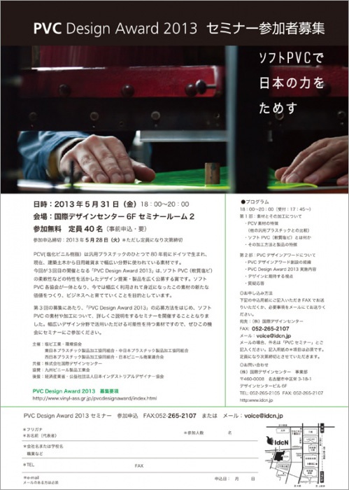 「PVC Design Award 2013」の応募受付(2013年5月7日〜8月7日)開始にあたり、同アオードの応募方法をはじめ、ソフトPVCの素材や加工について説明するセミナーが開催されます。