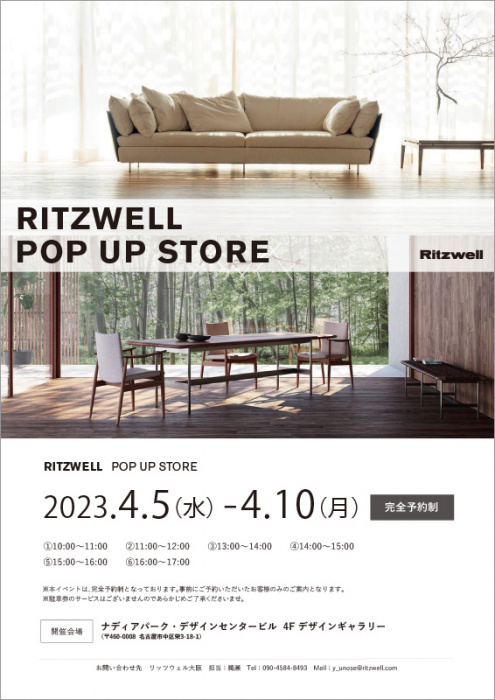 日本国内にて企画、デザイン、開発、製造を行う、日本の家具ブランド、リッツウェルが名古屋にてポップアップストアを開催。