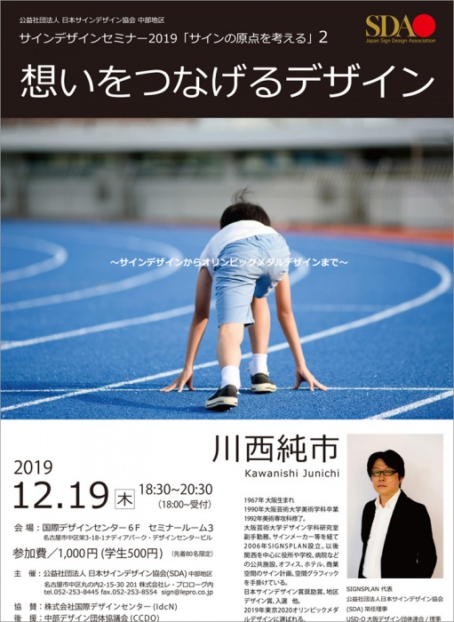 公益社団法人日本サインデザイン協会(SDA)中部地区が、東京2020オリンピックの入賞メダルのデザイナー、川西純市・SIGNSPLAN代表/SDA常任理事を講師に迎え、セミナーを開催。日頃手がけている公共施設やオフィス、商業空間のサインデザインから東京2020オリンピックのメダルのデザインに至るまで、「想いをつなげるデザイン」の制作のバックグラウンドが語られます。