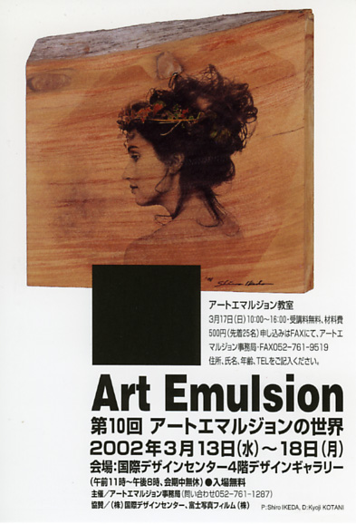 写真表現の一種、アートエマルジョンは、ネガさえあれば石や木など何にでも画像が現像できるユニークな手法。97年にデザインギャラリーで開催し、好評を得た。その後も全国的に作家を巻き込んで活動、今回はより多くの作家の作品を展示する。