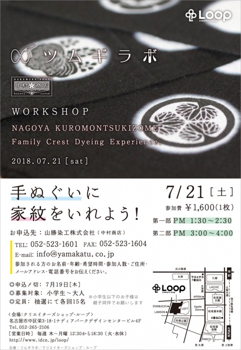 11期継続出店の「ツムギラボ」が、名古屋の染め職人の技を用い、手ぬぐいに家紋を入れるワークショップを開催します。