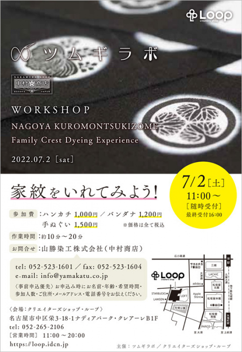 今回は、2022通年出店の「ツムギラボ」が、名古屋の染め職人の技を用い、手ぬぐいなどに家紋を入れるワークショップを開催します。