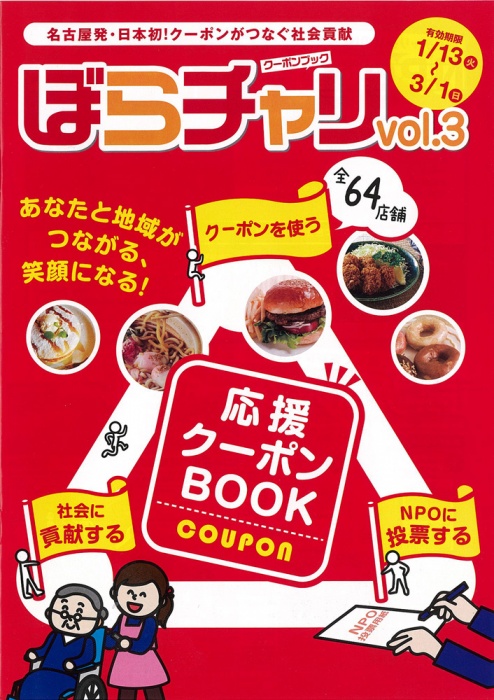 市民および企業の、ボランティア・寄付等社会貢献活動の促進のためのイベント「ぼらチャリ」。今年も、PRイベント「ぼらチャリパーク」がナディアパークを中心に開催され、協賛店舗でサービスが受けられ社会貢献につながるぼらチャリクーポンが使えます(1月13日〜3月1日)。