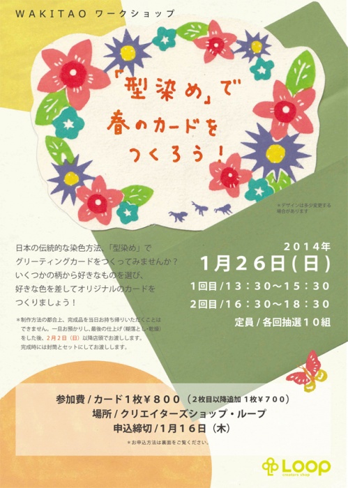 今回は、型染めのイラストレーションを元にグッズ等を販売するWAKITAO(ワキタオ)が、型染めを使ってカードを制作するワークショップを開催。古くから着物の染色等にも使われてきた伝統的な型染めの技を使った春のカードを制作します。数種類の型から好みのものを選んで糊置きし、乾燥して彩色。作家が最後の仕上げ(糊落とし、乾燥)をして、完成品を後日、Loop店頭でお渡しします。
