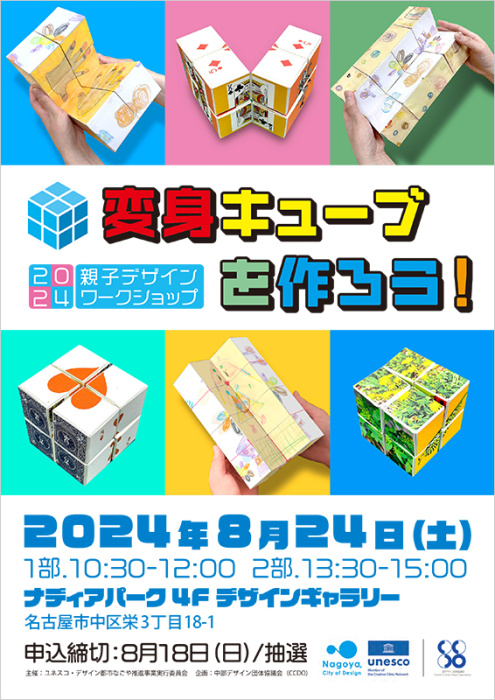 2024親子デザインワークショップ「変身キューブを作ろう!」(イベントスケジュール) https://2024.idcn.jp/archives/custom_event/240824_fdws 2024親子デザインワークショップ「変身キューブを作ろう!」(フライヤーPDF) https://2024.idcn.jp/wp-content/uploads/2024/240824_fdws.pdf ユネスコ・デザイン都市なごや https://www.creative-nagoya.jp/ |