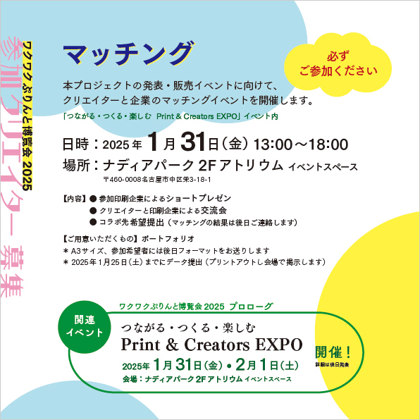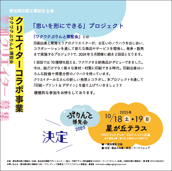 この事業は、昨年につづき、愛知県印刷工業組合会員企業の印刷・加工技術、ノウハウとクリエイターの構想力・デザイン力を掛け合わせる協働により新たな売れるプロダクトを開発するものです。開発された商品は、一般消費者向けイベント「ワクワクぷりんと博覧会」(星が丘テラス/2025年10月18日(土)・19日(日))で販売を予定しています。