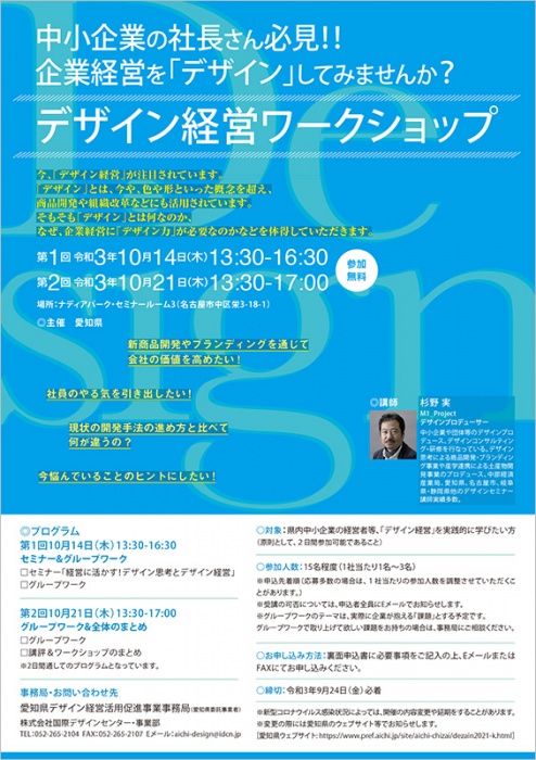 愛知県デザイン経営活用促進事業「デザイン経営ワークショップ」参加者募集(申込書/PDF) https://2024.idcn.jp/wp-content/uploads/2021/aichi-workshop.pdf 愛知県デザイン経営活用促進事業「デザイン経営ワークショップ」参加者募集(申込書/Word) https://2024.idcn.jp/wp-content/uploads/2021/aichi-workshop.docx 愛知県デザイン経営活用促進事業「デザイン経営ワークショップ」(イベントスケジュール) https://2024.idcn.jp/archives/custom_event/aichi-workshop 愛知県(公式サイト) https://www.pref.aichi.jp |