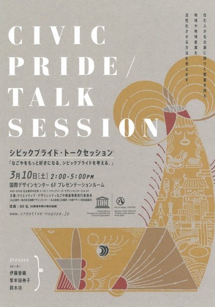 住む人が名古屋に誇りと愛着を持ち、地域や地域産業を活性化させる方法を考えます。イギリスで生まれた「シビックプライド(=市民が都市に対してもつ自負と愛着)」の考え方は、日本語の「郷土愛」とは少し違うニュアンスをもちます。自分はこの都市を構成する一員であるということ、この都市をより良い場所にするために関わってみると都市はもっと楽しくなります。「当事者」としての自覚を持って、人と人、人と都市のコミュニケーションを考えてみませんか。国内外のさまざまな事例を紹介。スピーカーとともに考えます。参加無料。定員80人。