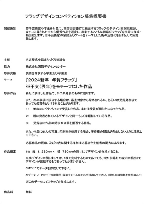 フラッグデザインコンペティション募集概要書(PDF) https://2024.idcn.jp/wp-content/uploads/2023/flag-design.pdf 栄町商店街振興組合 http://www.sakaemachi-shotengai.com |