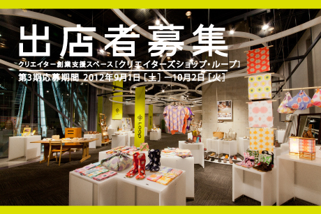 クリエイター創業支援スペース「クリエイターズショップ・ループ」は、デザイン・ファッション・工芸など、クリエイティブ産業分野で活動する若手クリエイターに場を提供し、活動をバックアップするショップです。その第3期(2012年11月23日〜)の出店者の募集が9月1日(土)よりスタート!