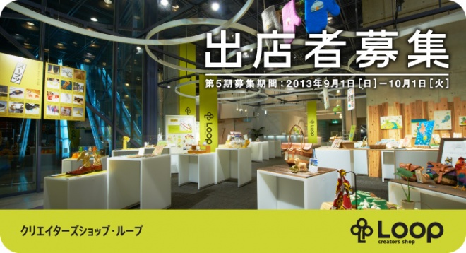 クリエイター創業支援スペース「クリエイターズショップ・ループ(Loop)」では、今回、2013年9月1日(日)より、第5期(出店期間:2013年11月22日(金)〜2014年5月18日(日))の出店者を募集します。