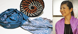 アフガニスタンの女性がていねいに刺繍を施したストールが美しいBASEYのブースに、吉井由美子が来店。大判のストールは巻き方ひとつで印象が変えられる便利なアイテム。クリエイターが実践している素敵な巻き方も店頭で参考に。