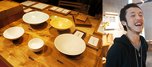 ショップ入口ブースでひと際目をひく「稲熊家具製作所」から、メンバーの長屋有が来店。すっきりと美しいフォルムにどこかあたたかみを感じさせる、飽きのこない器を制作。作品同様、飾りのない気さくなキャラクターも魅力の作家です。