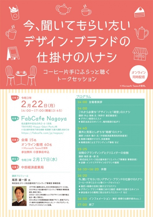 今回は、特許庁や中部経済産業局の講師陣、空間デザイン・ディスプレイデザインを手がける専門家を迎え、「デザイン思考」にも触れながら、ビジネスに直結する意匠・商標の関わりを、コーヒー片手に「なるほど…」とうなづいていただける“仕掛け”でカジュアルにお届けします。
