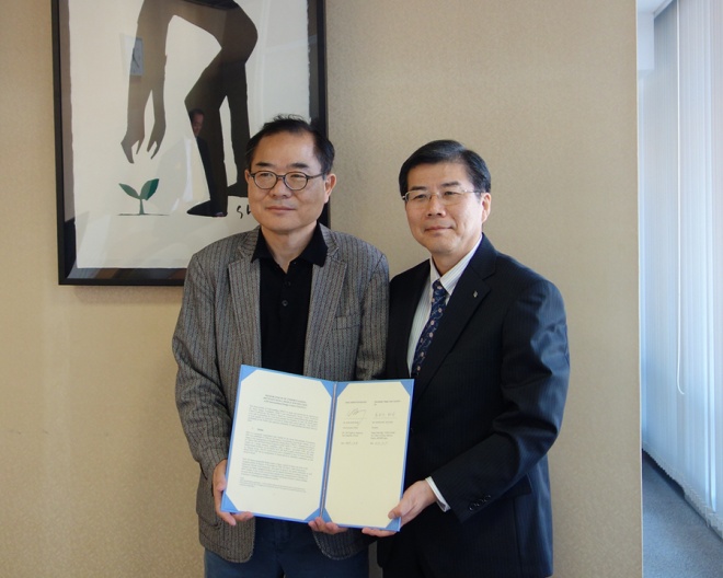MOUを手にする、ベク・ジョンウォン・ソウルデザイン財団CEO(左)と長谷川和司・国際デザインセンター社長(右)