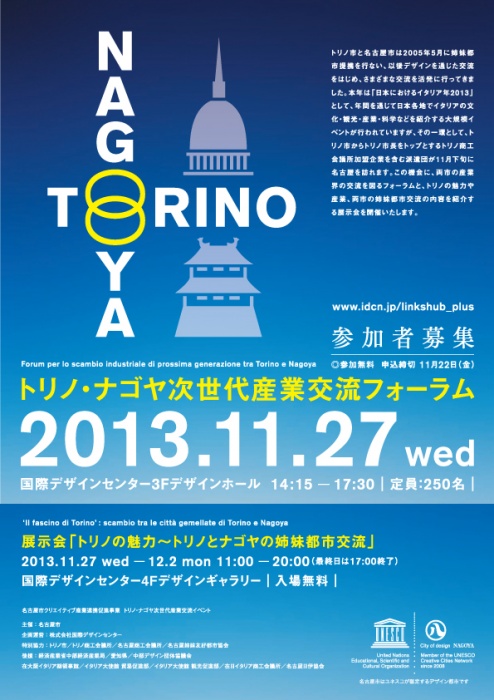 名古屋市とトリノ市は、2005年5月の姉妹都市提携以降、デザインをはじめ、さまざまな交流を行ってきました。 「日本におけるイタリア年2013」にあたる今年は、年間を通じて日本各地でイタリアの文化・観光・産業・科学などを紹介する大規模イベントが行われ、その一環として11 月下旬、名古屋へは、トリノ市長をトップとしたトリノ商工会議所加盟企業を含む派遣団が来訪。この機会にフォーラムと展示会を開催します。