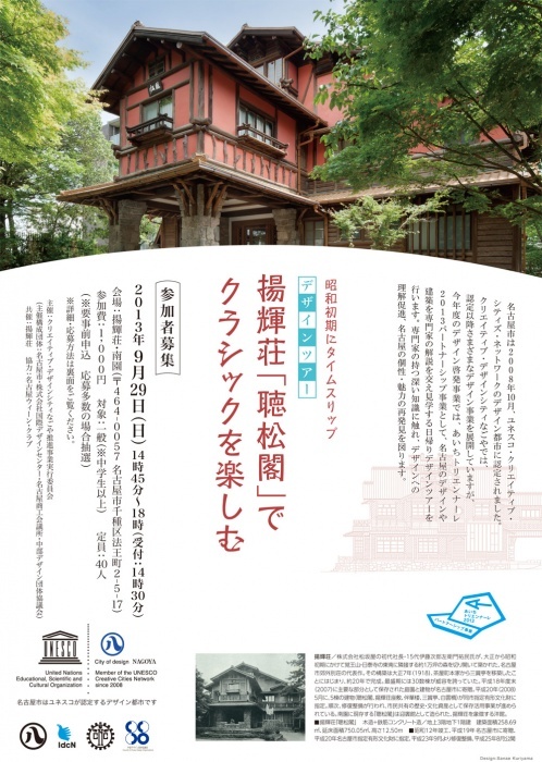 クリエイティブ・デザインシティなごやの今年度のデザイン啓発事業では、あいちトリエンナーレ2013パートナーシップ事業として、修復整備を終え今年8月に公開される揚輝荘(ようきそう)・南園「聴松閣(ちょうしょうかく)」を中心に、専門家の解説を交え見学、探訪し、昭和初期の名建築をクラシック演奏とともに堪能する、デザインツアーを行います。要事前申込。応募多数の場合、抽選。