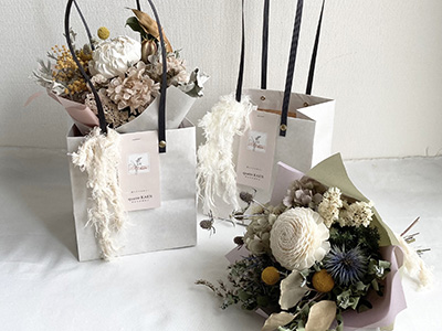 花の縁で繋がった4人の小さなお店。ドライフラワーのリースやスワッグをはじめ、日々の暮らしに彩りを添える花小物、アクセサリーを販売しています。メンバーそれぞれの感性をいかして作品を丁寧に作ることを心がけています。