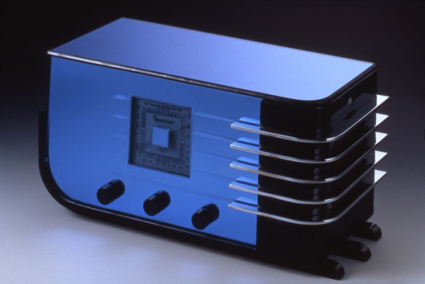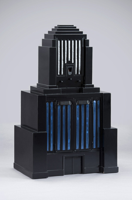 ブラックラッカーとコバルト・ブルー・ミラーの美しい幾何学形体。高さは約130センチ。家具?置物?実は大型ラジオである。ラジオという情報媒体が時代の先端を行くものだったころに、広い玄関ロビーやホールを飾ったのであろう。シン ...