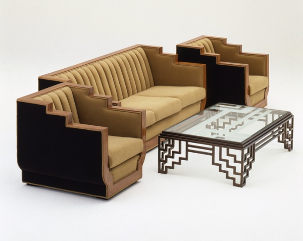 ソファの手すりやテーブルの脚の意匠など、随所にジグラット・パターンを用いたリビング・ルーム・セットはデザイナー、ポール・フランクルによるもの。ジグラットパターンとは、1920-30年代に高層ビルをモチーフにして流行した階 ...