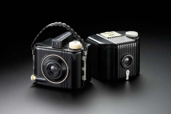 1930年代後期のコダック製「ベビーブローニーカメラ」。コダック社初の樹脂製カメラとなったこのモデルは、軽く、遮光性に優れたベークライトを使用している。成形が自由な樹脂素材ならではのスタイリングも目を惹くが、最大の特徴は ...