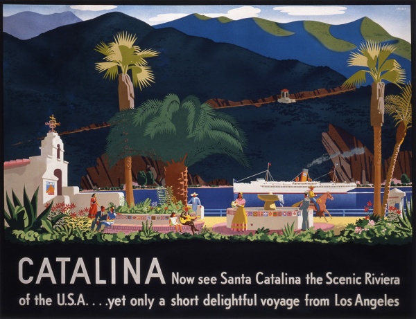 One of the dreams of average Americans of the period was to vacation in a warm, sunny location. This poster that invites the viewer to sightsee on Santa Catalina Island uses the illustrator’s skills to their full potential with its many-colored imagery and simplified expression.