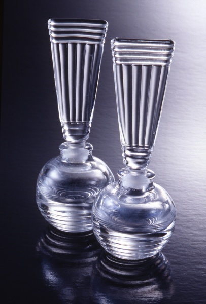 Representative of Art Deco design, the sharp, straight lines on the caps of these perfume bottles support the clarity of the glass and give these pieces an atmosphere of modernity surpassing the era.