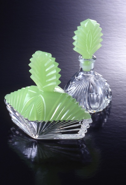 These glass items, with their pineapple motif, create a tropical mood. The color of the caps, which came to be known as “Depression Green”, was very popular at the time.