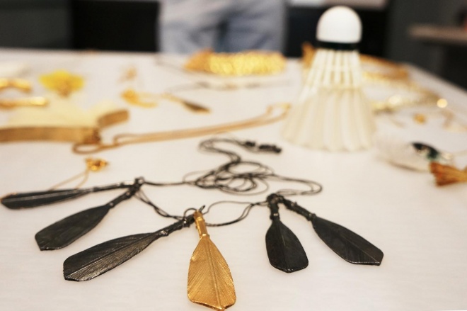 Among Mirit Weinstock’s jewelry are many pieces inspired by traditional Japanese ornaments. For instance, the primary material in her shuttlecock collection is a gold or silver coating applied with the “electroforming” process. This collection is a product of her fascination with a characteristic of some Japanese jewelry that looks massive but is actually lightweight. She has also developed a collection featuring a combination of raffia and twigs deriving inspiration from the traditional Japanese packaging method of stringing together a row of fish, a method introduced in the book “How to Wrap Five Eggs”. Both collections, utilizing unique materials, are the result of her inspirational insight into Japanese culture, her beginnings in a career as a fashion designer and her individualistic interpretation and aesthetic sensitivity.
