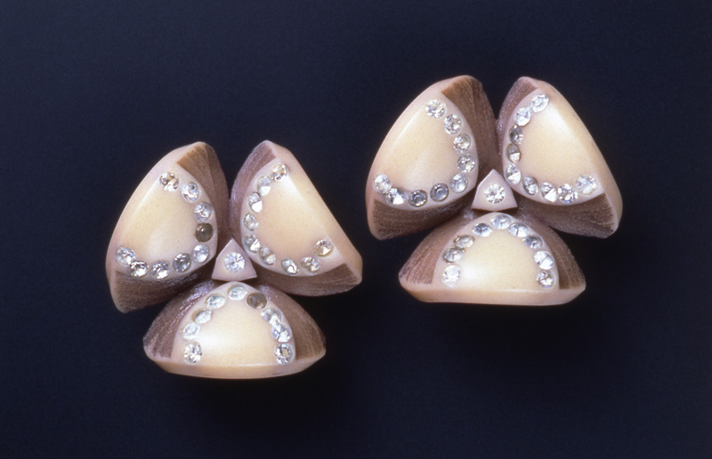 Thanks to the rich expressiveness of plastic, it also wielded a great deal of power in the fashion industry. Against the backdrop of women’s social advancement, plastic was even more quickly incorporated into the expanding jewelry field, where items like accessories and baubles, initially treated as high priced items featuring precious stones, in the 1930s began appearing in plastic in great quantities, capitalizing on the forms and colors made possible by the new material.
