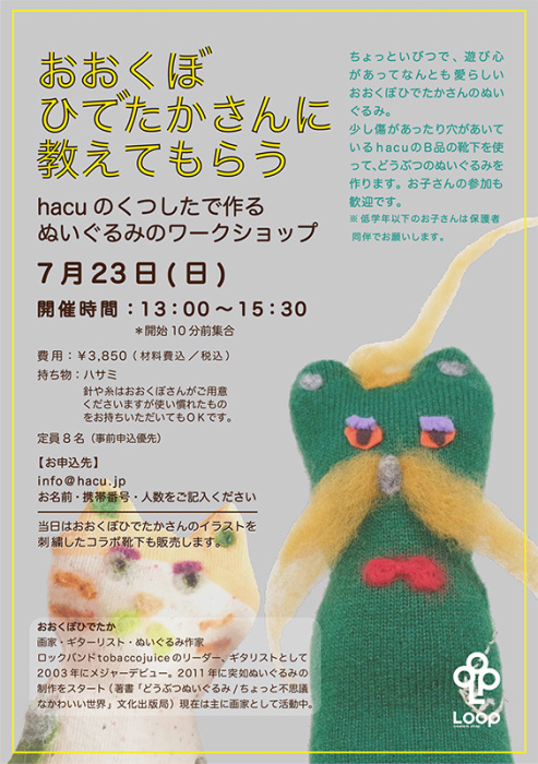 hacu Workshop: Hidetaka Okubo Instructs Making Stuffed Animals from hacu Socks (Flyer image)