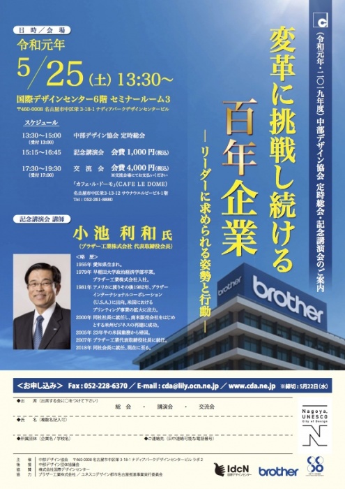 A commemorative lecture will be held by the Chubu Design Association in conjunction with it’s general assembly. In FY 2019, Toshikazu Koike/Chairman & CEO, Brother Industries, Ltd. will be invited as a lecturer. Through over 20 years of business experiences in the United States, the lecturer will give a valuable talk based on his contribution to the development of Brother Industries, Ltd..