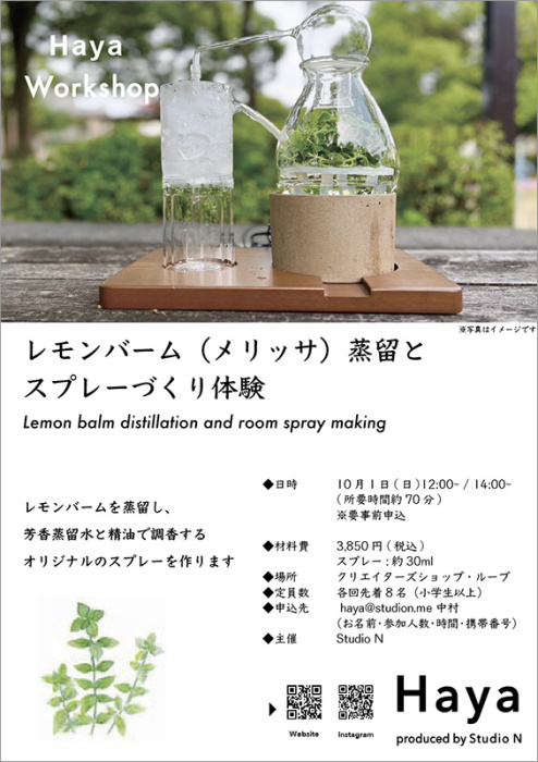 This time, “Haya”, which appears from September 1 to October 11 in the 2023 session, holds a distillation experience event where you can bring home a 30ml original spray made by distilling lemon balm and essential oils.