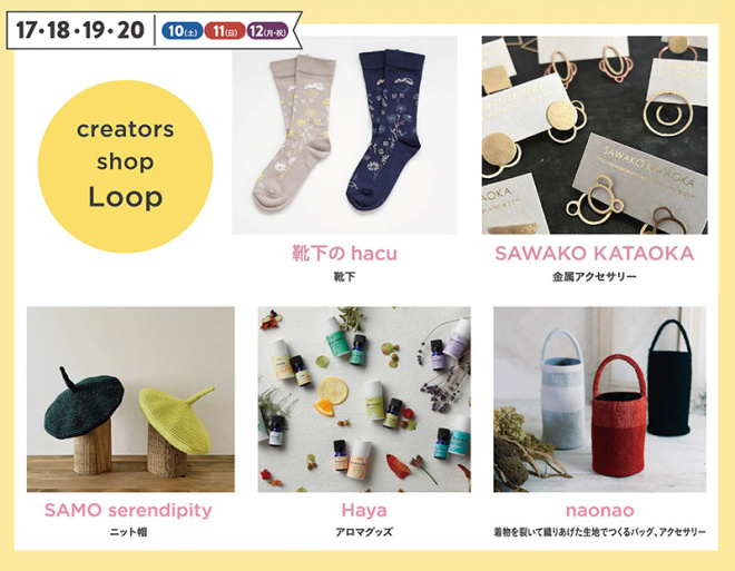 NADYA Park Holiday Market “Flowers and Accessories” is being held at NADYA Park, which collects accessories, and miscellaneous goods and small items with flower motifs. There will be a total of 23 stores, including 20 merchandise stores in the 2nd-floor atrium event space and 3 food trucks in the 1st-floor outdoor event space (northeast and northwest). From creators shop Loop, five tenants will be present: SAMO serendipity, SAWAKO KATAOKA, naonao, hacu, and Haya.
