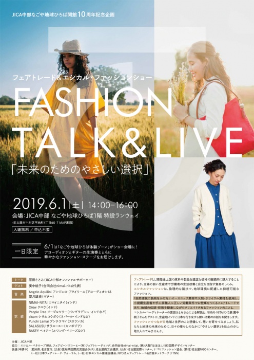 A brilliant fashion show will be held with commentary by Ethical Coordinator, Satomi Harada (official supporter/JICA Chubu) and live accordion and guitar performance at Nagoya Global Plaza Experience Zone on June 1st. In addition, there will be a talk show receiving Momoko Hironaka (representative/nimai-nitai LLC.), who travels back and forth between Japan and producing country India, as a speaker.