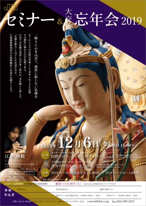 The “Year-end Exchange Party” is an annual exchange event held by the Japan Interior Architects/Designers’ Association (JID) Central Japan area for the local interior community. This year, in conjunction with the party, a seminar will be held with Rinkan Eba, director of Eba Buddhist Sculpture Studio as a lecturer. Buddha statues have long been worshipped as objects of faith. Mr. Eba, a Busshi (Buddhist image maker) who is involved in the production, will talk about what it is like to “sculpt a buddha statue”.