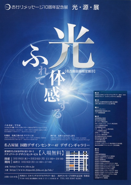 | Co-organaizer(s). etc. | Cooperation: Axis Gallery, Lighting Designers Association, Koube akari Club, Sponsors: Iwasaki Electric Co., Ltd., Endo Lighting Corp., Odelic Company, Color Kinetics Japan Inc., Koizumi Lighting Technology Corp., Daiko Electric Co., Ltd., Toki Corp., Nippo Electric co., Ltd., Nippon P.I.. Co., Ltd., Maxray Inc., Maruwa Shomei Co., Ltd., Morikawa SS Co., Ltd., Yamagiwa Corp., Yamada Shomei Lighting Co., Ltd., International Design Center NAGOYA Inc., Supporters: City of Kobe, City of Sapporo, Hokkaido Government Board of Education, Japan Industrial Design Promotion Organization, Japan Design Foundation, The Illuminating Engineering Institute of Japan, Lighting Designers & Engineers Association of Japan Inc., Japan Interior Architects/Designer's Association, Japan Graphic Designers Association Inc., Japan Craft Design Association, Japan Sign Design Association, Japan Jewellery Designers Association, Japan Display Design Association, Japan Package Design Association, Council of Chubu Design Organizations, Hokkaido Design Association |