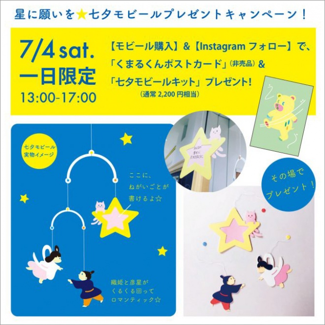 This time, “Manu Mobiles” the year-round tenant of the 13th session, will hold a giveaway campaign as a commemorative event. By purchasing mobiles and following their instagram, you will receive a set of the “Tanabata Mobile Kit” and their brand character “Kumaru-kun” postcard. Only on July 4.