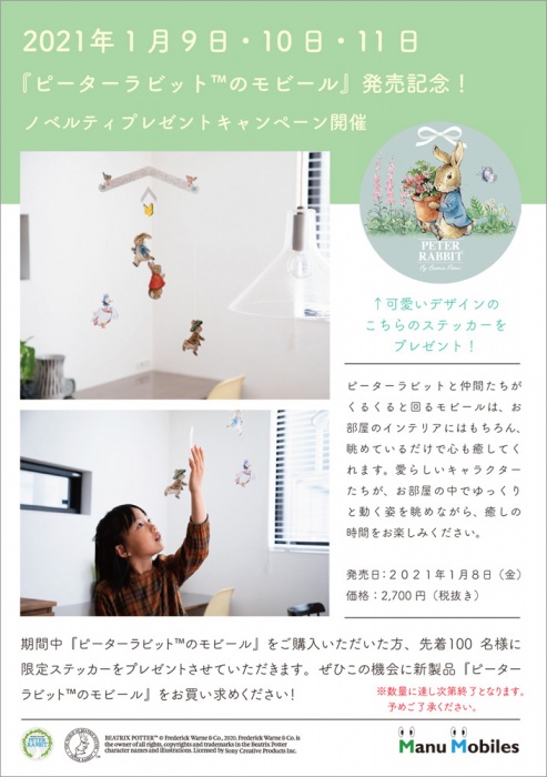 This time, “Manu Mobiles” the year-round tenant of the 13th session, will hold a giveaway campaign. A limited sticker will be given to the first 100 people who purchase “Peter Rabbit ™ Mobile” for 3 days from Saturday, January 9th to Monday/ holiday, January 11th.