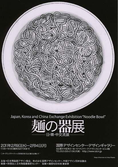 The theme for this exchange exhibition is the noodle bowl in Japan, Korea and China, countries that share the food culture of the noodle. Displayed will be 39 bowls created by ceramists belonging to the Pottery Design Organization of Japan, Korea Ceramic Design Association and China.