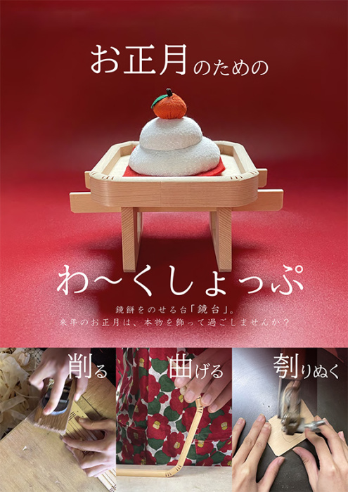 This time, “NUSA” which appears from November 23 – January 5 in the 2024 session, will hold a workshop to make a “Kagamidai (a stand for Kagami-mochi (round rice-cake))” to be displayed during the New Year season. Using Kiso cypress as the material, the workshop will use the “Sanpo (a small wooden stand on which to place an offering)” technique of traditional crafts of Owari Butsugu (buddhist altar utensils) to shave, bend, and hollow out the material. You can choose from four types of foot hole shapes (normal/snake/pine/sunrise).